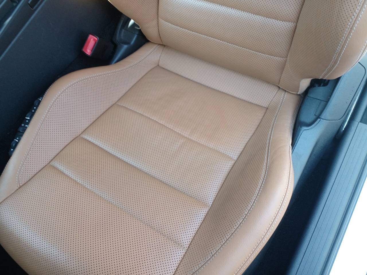ベンツ シート染みリペア 2025/05/14 ベンツの革シート…車種忘れました😅 何やら派手なシミ(染み)が出来てます。 見立てとしては、アルコール系または油性系の液体をこぼして暫く放置してしまったのかなぁ…と言った感じです。 お尻の辺りが激しく変色してますが、もも裏が当たる辺りも軽く変色しております。 だいぶ液体が深くまで浸透してしまっていたようで、素材自体も少し伸びてしまってた感じです。 スチームアイロンで出来る限り“伸び”を解消します。 完全には戻りませんが、いくらかマシになった気はします。 仮に染みの原因が油性系だったとすると、下の方に油の成分が残っていると後からまた表面に浮き出て来る可能性も有るので、脱脂は念入りに…。